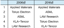 실제, 2006년과 2016년 반도체 장비 업체 'Top5'를 비교해 봤을 때, 신규 기업의 진입은 한건도 없다.