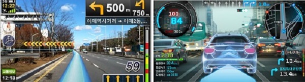 AR기술을 활용한 내비게이션은 실제 도로 화면과 진행방향, 거리, 이동시간, 도착시간 및 주변 차량의 주행상태와 전방신호 등의 상태를 화면에서 볼 수 있다.