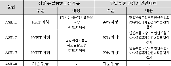 'ASIL'은 1억 시간 동안 연속 사용했을 때 사고로 이어질 수 있는 고장을 1회 이하로 관리하는 가장 엄격한 등급이다.
