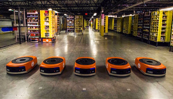 아마존 물류센터에는 대략 4만 대의 로봇 ‘키바(KIVA)’가 근무하고 있다. 로봇청소기와 닮은 납작한 모양의 로봇으로 최대 1.4t까지 들어 올릴 수 있다.