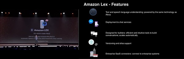 아마존 렉스(Amazon Lex)는 음성과 텍스트를 사용하는 대화형 인터페이스를 구축하는 서비스다. 아마존 렉스에서는 알렉사에서 사용되는 것과 같은 딥러닝 기술을 모든 개발자에게 제공하고 자연어 기반 대화형 봇인 ‘챗봇’을 쉽고 빠르게 구축할 수 있다.