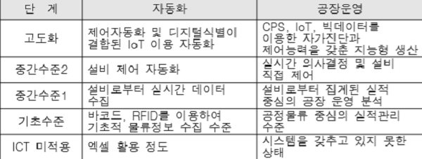 IT 기술 활용 정도 및 역량에 따라 스마트팩토리를 ▲일부 공정 자동화, ▲ IT기반 생산관리, ▲IT 소프트웨어 기반 실시간 통합제어, ▲IoT 기반 맞춤형 유연생산 등 4단계로 구분해 단계별 고도화를 추진한다. 이중 일부 공정 자동화는 기초단계에, IoT 기반 맞춤형 유연생산은 고도화된 단계에 속한다.