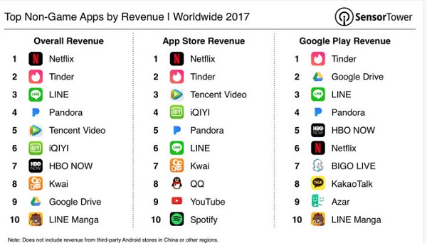 2016년 비게임 앱 중 매출 기준 14위에 그쳤던 텐센트는 한해만에 3위로 올라섰다.