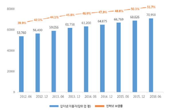 2016년 6월 기준 중국은 이미 미국과 유럽의 이용자를 합친 수치보다 더 많은 7억 1,000만 명의 인터넷 이용자를 보유하고 있으며, 온라인 보급률은 2016년 51.7%로 증가했다. 2016년 6월 6억 5,600만 명(92.5%)의 스마트폰 사용자가 중국 대도시 내의 ‘스마트 시티’와 ‘와이어리스 시티’ 공공 무선 연결망을 통해 온라인에 접속했다.
