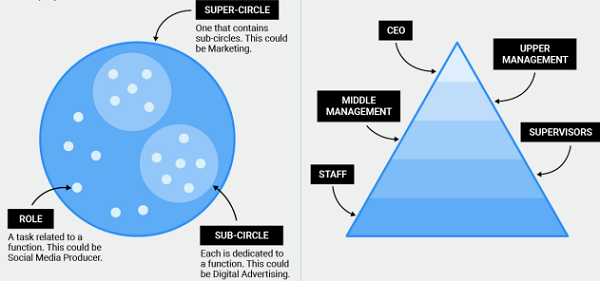자포스의 모델은 민주적으로 스스로 조직하는 팀들 중심으로 구성 운영되면서 직원들은 다양한 팀에 참여하여 자율적으로 활동한다. 팀간의 활동에서 중복현상이 발생하는 경우가 있기 때문에 이들 간의 역할을 중재하고 연계시키는 임무는 그동안 위계조직의 탑이 그 기능을 바꿔 담당한다.