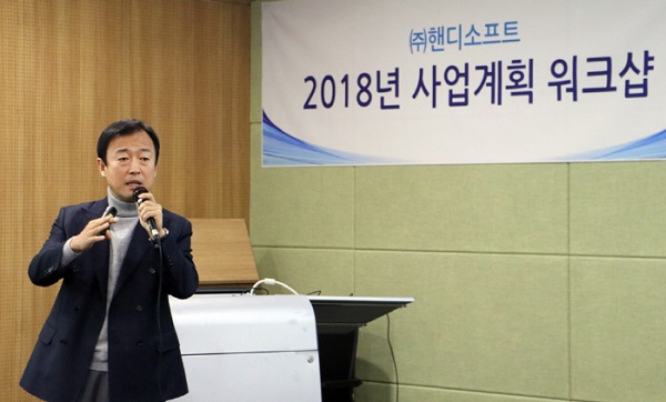 핸디소프트는 지난 19일 판교 경기창조경제혁신센터에서 '2018년 사업계획 워크샵'을 열고 제품 라인업 강화 및 시장 확대를 위한 전략적 영 업, 마케팅 활동 계획을 확정했다.