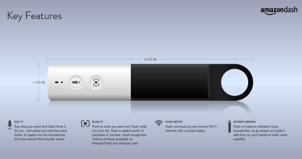 대쉬버튼만 누르면 홀푸드마켓의 신선식품이 집으로 배달되는 IoT 기술을 적용한 주문 서비스다.