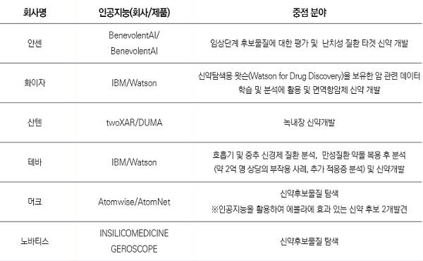 인공지능 기업과 협력해 신약 개발에 착수하기 시작했으며, 효과성 및 효율성을 높여 성공률과 수익성 제고에 박차를 가하고 있다. 화이자, 얀센 등은 이미 인공지능을 활용해 난치성 질환, 면역항암제의 신약을 개발중에 있다.