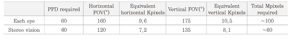예를 들면 시력이 1.0인 사람을 기준으로 가장 미세하게 구분할 수 있는 각도가 1/60도 이고, AR/VR 기기에 적용되는 마이크로 디스플레이는 2차 평면의 영상으로 광학계를 활용해 3차원처럼 표현하기 때문에, 단위 면적이 아닌 단위 각도 당 필요한 픽셀의 개수, 즉 공간 분해능으로 정의하는 것이 바람직하다는 것이다.