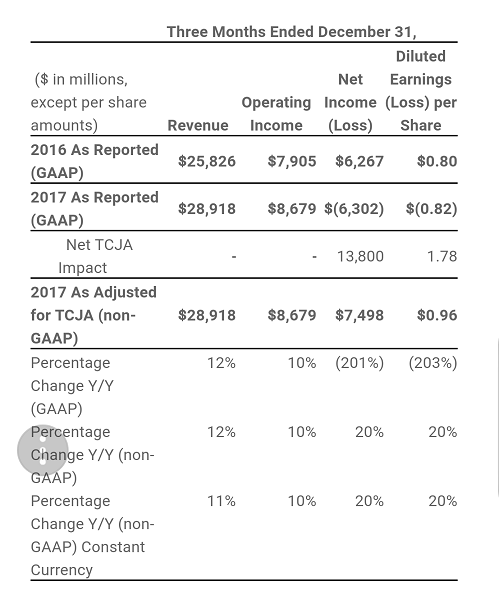 GAAP는 일종의 범용 회계기준으로 이해해도 무방하다. 그러니까 MS의 설명은 감세와 일자리법인 'TCJA'가 자사의 2분기 실적에서, 세후 이익이 적자로 돌아서는데 주된 영향을 줬다는 것이다. 이를 포함한 일회성 비용처리 규모는 138억달러, 원화로는 대략 14조원에 달한다.
