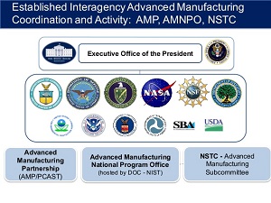 이를 위해 백악관 내 제조업 정책국을 설립하고, 상무부 NIST에 첨단 제조 국가프로그램 사무국(Advanced Manufacturing National Program Office, AMNPO)을 설치해 제조혁신 네트워크와 첨단 제조업 파트너쉽 운영하고 있다.