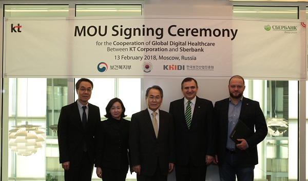 KT(회장 황창규)는 14일 러시아 국영은행인 스베르방크(Sberbannk)와 디지털 헬스케어 사업 추진을 위한 포괄적 업무협약(MOU)을 러시아 모스크바 스베르방크 본사에서 체결했다고 밝혔다.