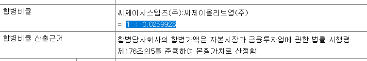 두 회사의 자산 규모가 비슷하고, 오히려 스스로 납입한 자본금 규모는 CJ올리브영의 CJ시스템즈보다 10배가 넘지만, 합병 비율을 정하는데 있어서는 오히려 선호씨가 지분을 보유한 CJ시스템즈의 기업가치가 CJ올리브영보다 40배(합병비율1: 0.025)나 높게 평가됐다. 자산 및 순익 등을 종합적으로 평가한 결과다.