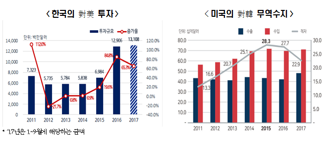 한국의 對美 투자액은 2017년 1~9월중에 집계된 금액만 131억 달러로 한미FTA가 발효된 2012년 당시 57억 달러에 비해 두 배 이상 급증했다. 미국의 對韓 서비스수지 흑자는 매년 100억 달러 이상으로 한국은 미국의 서비스 수출에 큰 도움을 주고 있다. 미국의 對韓 무역수지도 개선 중이다.