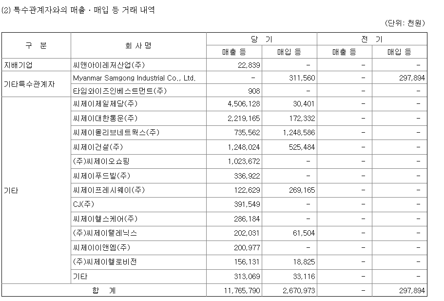 에스지생활안전이 2016년 CJ제일제당, CJ대한통운, CJ올리브네트웍스, CJ건설, CJ푸드빌 등 대부분이 CJ 계열사들로부터 거둔 매출은 117억원으로 표기돼 있다.