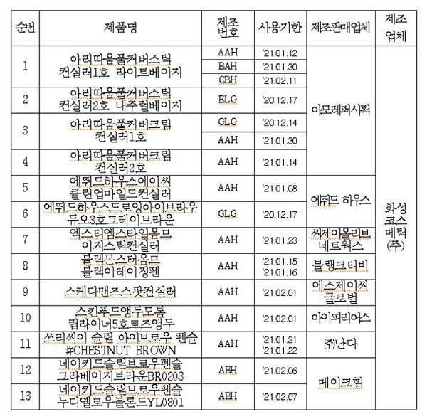 이번 회수대상은 해당품목을 위탁해 생산한 화성코스메틱이 자가품질검사 과정에서 안티몬 허용기준을 위반한 것으로 확인한 품목이다.