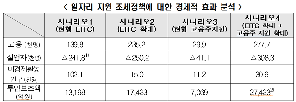 보고서는 현행 EITC(시나리오1)와 EITC 확대안(시나리오2), 그리고 현행 고용주 지원제도(시나리오3), EITC 및 고용주지원제도 확대안(시나리오4) 등 총 4개 시나리오별 고용효과를 비교해 이같은 분석을 진행했다.
