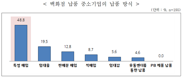 납품 중소기업이 백화점과 거래하는 방식은 특정매입이 가장 높게 나타났으며 그와 유사한 임대을, 판매분 매입의 비율도 각각 10% 이상이었다. 그에 반해 직매입 비율은 8.7%로 재고를 백화점 납품기업이 부담하는 상황이 개선되지 않고 있는 것으로 나타났다.