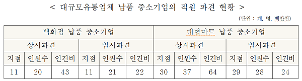 또한, 백화점과 대형마트의 판매촉진을 위한 중소기업의 상시파견에 따른 비용 부담이 백화점 납품 기업은 월평균 4300만원, 대형마트 납품 기업은 월평균 6400만원에 달하는 것으로 조사됐다.