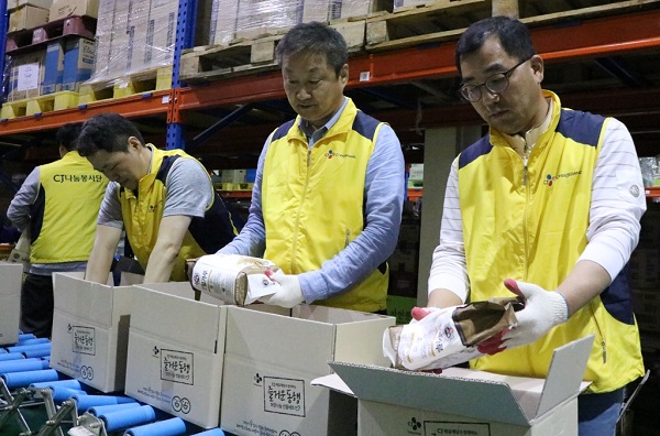 신현재 대표 등 CJ제일제당 임직원들은 지난 23일 서울 도봉구에 위치한 서울광역푸드뱅크에서 CJ제일제당 제품으로 이뤄진 ‘희망나눔 선물세트’ 총 3,000세트를 조립했다. ‘희망나눔 선물세트’는 설탕, 밀가루, 식용유, 고추장 등 기초 소재 식품으로 구성됐으며, 4인 가족이 약 3개월 간 먹을 수 있는 분량이다.