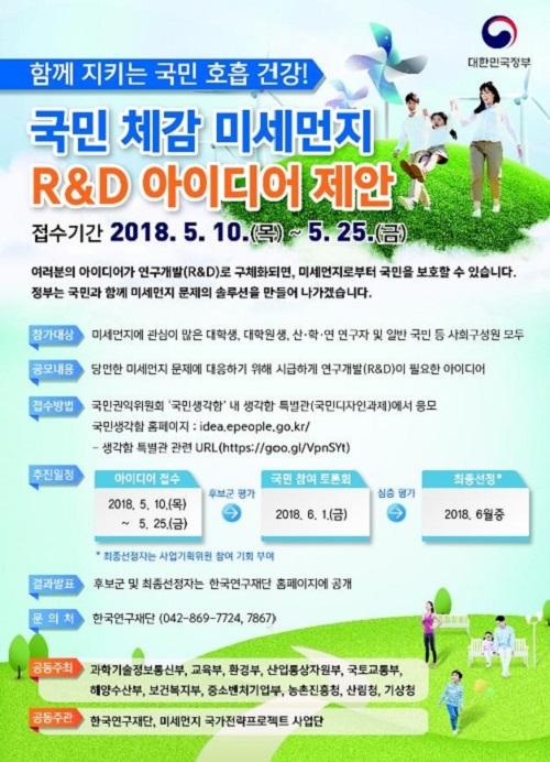 정부는 지난 8ㄹ일 정부과천청사에서 범부처 미세먼지 연구개발(이하 R&D) 협의체를 구성하고, 국가전략프로젝트(미세먼지 국가전략프로젝트 사업단) 등 정부 주도의 미세먼지 연구개발과 병행해 미세먼지 해결을 위한 국민들의 다양한 아이디어를 모아 미세먼지 해결에 활용하는 ‘미세먼지 국민 아이디어 R&D 사업’을 추진키로 했다.