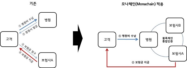사업적 측면에서도 고객 지향적 서비스가 가능하다. 예를 들어 기존에는 병원에서 증명서를 발급받고 보험사에 청구한 후 보험금을 지급 받았다면, 모나체인 환경에서는 사용자가 병원에서 의료비 결제만으로도 보험금을 자동으로 수령하게 된다.