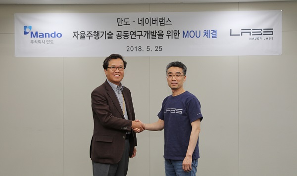 [뉴스비전e 정윤수 기자] 네이버의 기술연구개발 법인 네이버랩스㈜(대표 송창현)가 ㈜만도(대표 정몽원)와 자율주행기술 공동 연구개발에 대한 양해각서(MOU)를 체결했다고 25일 밝혔다.