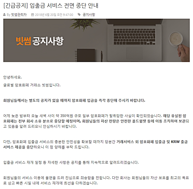 빗썸은 20일 공지사항을 통해 암호화폐 입출금 서비스를 전면 중단한다고 밝혔다. 별도의 공지가 있을 때까지 암호화폐 입금을 즉각 중단해 달라고 회원들에게 요청했다.