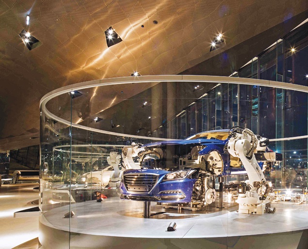 키네틱 스컬프처는 현대자동차의 디자인 철학을 상징하며 1,411개의 알루미늄 기둥들이 영상, 음향, 조명과 함께 어우러져 유기적이고파격적인 움직임을 선보인다.