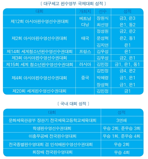 2003년 개교한 대구체육고등학교는 길지 않은 역사지만 과감한 결단과 투자로 핀수영부 창단 후 필자가 2012년 감독으로 부임해 3명의 핀수영 선수를 육성하기 시작했다.