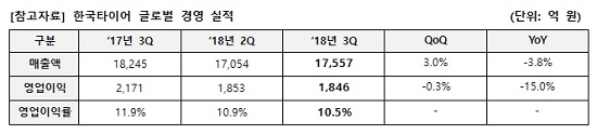 [뉴스비전e 김광훈 기자] 한국타이어가 2018년 3분기 글로벌 연결 경영실적 기준 매출액 1조7,557억 원과 영업이익 1,846어거 원을 달성했다.