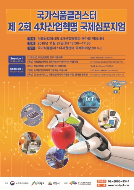 [뉴스비전e 김광훈 기자] 국가식품클러스터(이사장 윤태진)는 농식품부, 전라북도, 익산시가 주최하고 국가식품클러스터지원센터(전북 익산 소재)가 주관하는 「제2회 4차 산업혁명 국제심포지엄」을 오는 11월 27일(화) 국가식품클러스터(이하 국클)에서 개최한다.