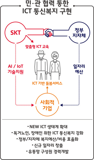 SK텔레콤은 정부∙지방자치단체, 사회적 기업에 자사의 ICT 기술 및 유통망 인프라를 개방∙공유함으로써, 독거노인이나 장애인 등 사회적 약자에 대한 돌봄 사업 강화에 기여할 계획이다. 지방자치단체는 사회적 기업에 관련 일자리 예산을 지원하고, SK텔레콤은 AI∙IoT 등 자사 ICT 기술을 지원한다.