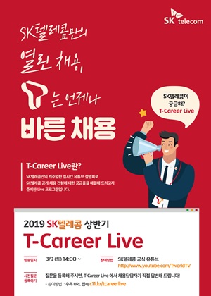 [뉴스비전e] SK텔레콤 9일 오후 2시 SK텔레콤 공식 유튜브 채널에서 '2019 상반기 인턴사원 채용' 지원자를 위한 채용설명회‘T 커리어 라이브(T-Career Live)’를 개최한다.