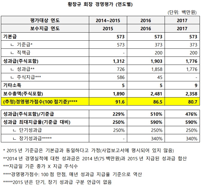 연봉 내역은 더욱 가관이다. KT 새노조에 따르면, 대부분 성과급으로, 황 회장은 매년 80점(100점 만점) 이상의 높은 평가를 받았다. 그간 불법정치자금과 채용비리, 아현화재 같은 일련의 사태를 감안하면 오히려 최하점도 아까운 상황인데 말이다.