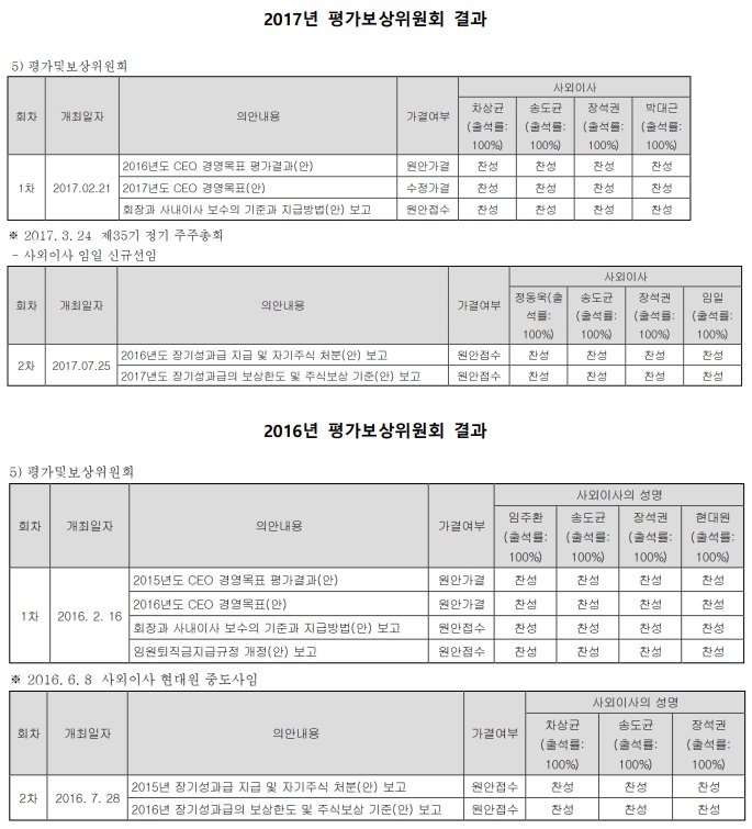 KT 회장에 대한 평가는 이사회 내 평가및보상위원회에서 결정한다. 2014년부터 2017년까지 평가및보상위원회 전원이 모든 안건에 100% 찬성했다는 것은 넌센스다.