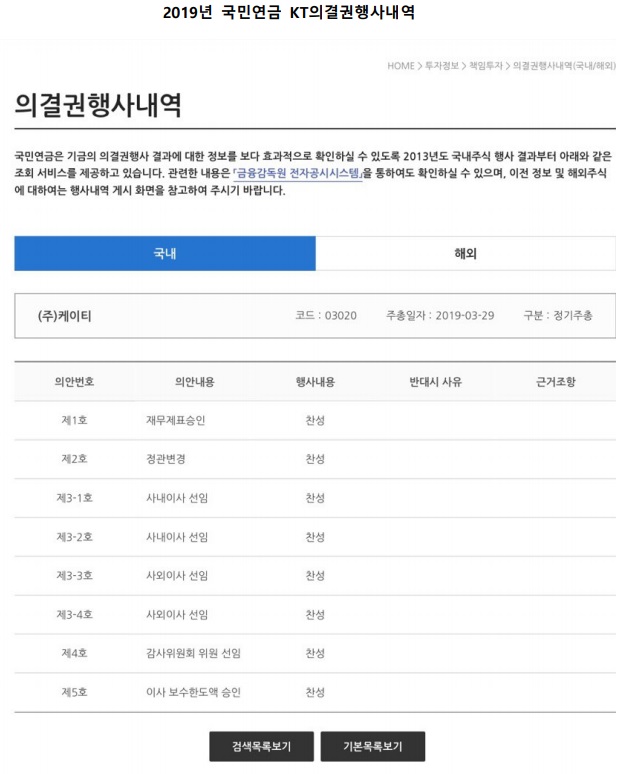 KT 주주총회는 최대주주인 국민연금조차 사실상 거의 모든 안건에 찬성할 뿐 전혀 견제하지 않고 있다. 올해도 국민연금은 모든 안건에 찬성했다.