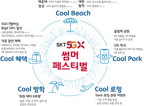 SK텔레콤은 국내 대표 여름 피서지를 여러 테마의 비치로 구성해 SK텔레콤 고객만 누릴 수 있는 이색 체험과 차별화된 혜택을 제공할 계획이다. 7월 30일부터 8월 15일까지 부산 해운대, 강원도 망상, 충남 대천, 제주 함덕 해수욕장 등 여름철 고객들이 가장 많이 찾는 『5G 썸머 클러스터』에서 ‘5GX 쿨비치’를 운영한다.