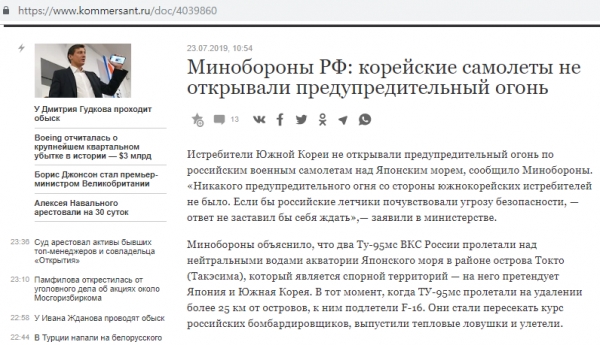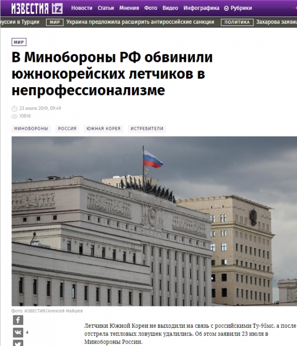 그리고 모스크바 시간으로 23일 10시(우리시간 오후 4시)쯤 이즈베스티야(09시 54분)와 코메르산트 (10시 54분) 등 러시아 유력언론들이 러시아 국방부의 기본 입장을 전했다. "러시아군이 23일 중국군과 합동으로 계획된 초계비행을 실시했다. 한국 공군기들이 러시아 조종사들과 사전 교신에 나서지 않고, 무단으로 비행의 안전을 위협하는 공중 폭거를 저질렀다"는 내용이다.
