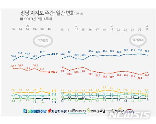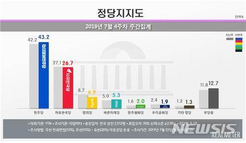 여론조사 전문기관 리얼미터는 YTN의 의뢰로 실시한 7월 4주차(22~26일) 주간 집계 결과다. 민주당 지지율의 직전 최고치는 5월2주차였던 42.3%였다.
