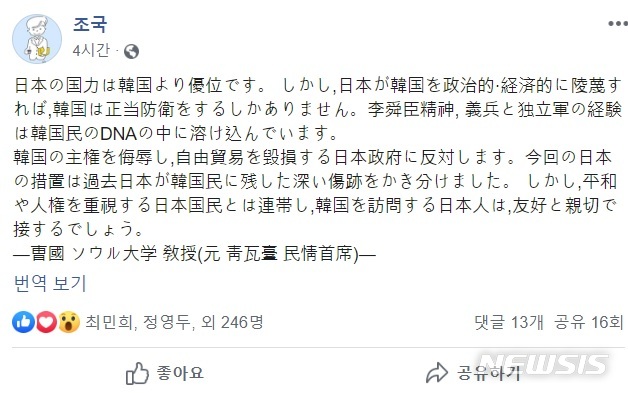[뉴스비전e] 조국 전(前) 청와대 민정수석은 6일 페이스북에 일본 정부의 폭주에 반대하는 일본인들과 연대하고 싶다는 일본어 게시물을 올렸다.