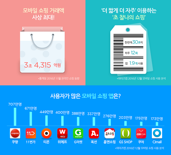 3일 와이즈앱에 따르면, 모바일 쇼핑 이용자들은 평균 1.9개의 쇼핑 앱을 하루 12번씩 방문해 한 번에 30초의 시간을 사용하는 것으로 나타났다.