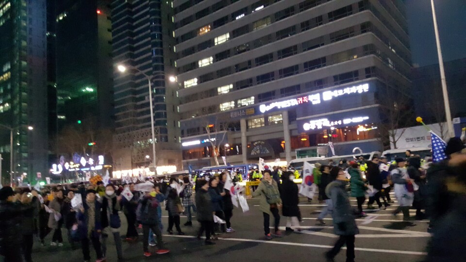 '대통령 탄핵 기각을 위한 총궐기 운동본부'는 7일 오후 삼성동 코엑스부터 선릉역 인근 박영수 특별팀이 있는 대치빌딩까지 이동해 집회를 열었다. 이어 테헤란로를 따라 강남역까지 3.6km를 행진하며 '누명탄핵 원천무효' 등을 외쳤다.