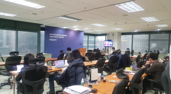 - 주요 인사 기다리는 특검앞 사무실 앞 카메라... 노동 단체 "황창규 KT 회장 구속하라" 농성