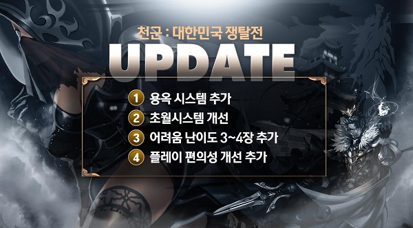 [뉴스비전e 장연우 기자] 와이디온라인(대표 신상철)은 자사에서 개발하고 서비스 중인 전략 액션 RPG ‘천군 : 대한민국 쟁탈전’이 새해 첫 업데이트를 진행한다고 12일 밝혔다.