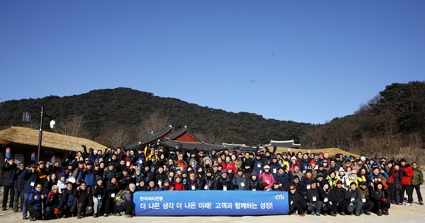 [뉴스비전e 이미정 기자] 새해를 맞아 박진회 한국씨티은행장을 비롯한 300여명의 한국씨티은행 임직원들이 지난 1월 14일 400년의 역사와 수려한 자연환경을 간직하고 있는 경기도 광주시 소재 남한산성에서 신년 트레킹을 실시했다. 한국씨티은행 임직원들이 더 나은 생각으로 더 나은 미래를 열고, 고객과 함께하는 성장을 실현하겠다는 새해 각오를 다지며 기념촬영을 하고 있다.