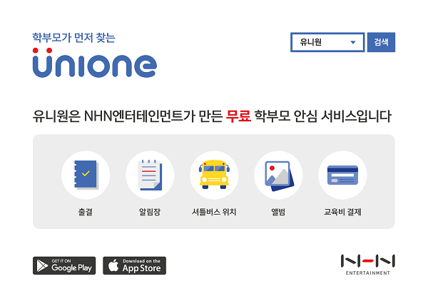 [뉴스비전e 장연우 기자] NHN엔터테인먼트(대표 정우진)가 서비스하는 학원운영 관리 및 소통 앱 <유니원(UNIONE)>이 한국교육·녹색환경연구원이 주최하고, 교육부가 후원하는 ‘2017교육박람회’에 참가한다.
