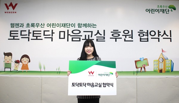 웹젠은 지난 1월 13일, 판교에 위치한 웹젠 본사에서 ‘초록우산 어린이재단’ 산하 ‘중탑사회복지관’과 어린이/청소년 대상 심리치료프로그램 '토닥토닥 마음교실'을 함께 운영하기로 약속하고 이에 필요한 기부금을 전달했다.