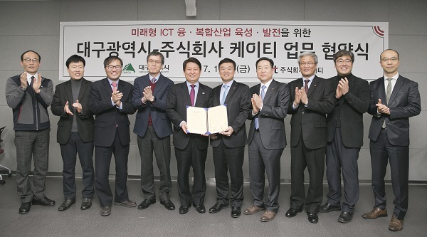 [뉴스비전e 정윤수 기자] KT(회장 황창규, www.kt.com)와 대구광역시(시장 권영진, www.daegu.go.kr) 가 20일 KT 대구본부에서 미래형 스마트시티의 실현과 ICT 융복합 산업의 활성화 협력체계 구축을 위한 업무협약을 체결했다.