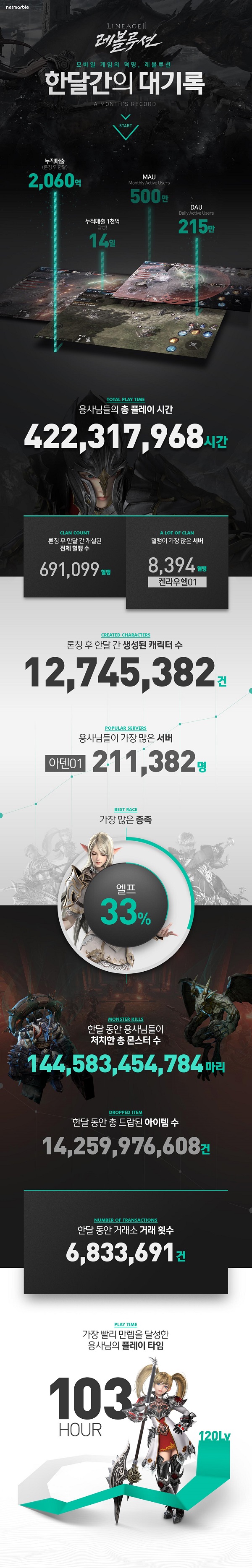 [뉴스비전e 장연우 기자] 넷마블게임즈(이하 넷마블, 대표 권영식)는 초대형 모바일 MMORPG (다중접속역할수행게임) '리니지2 레볼루션(이하 레볼루션, 개발사 넷마블네오)'에서 출시 한 달 간의 기록을 공개한다고 23일 밝혔다.